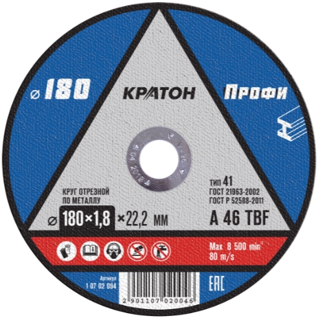 Диск отрезной по металлу 180*1,8*22 Кратон A46 TBF