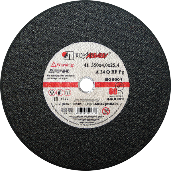 Диск отрезной по металлу 355*4,0*25,4 Луга А24 A 24 Q BF, для рельсовой стали, 4400 об/мин, 80м/сек