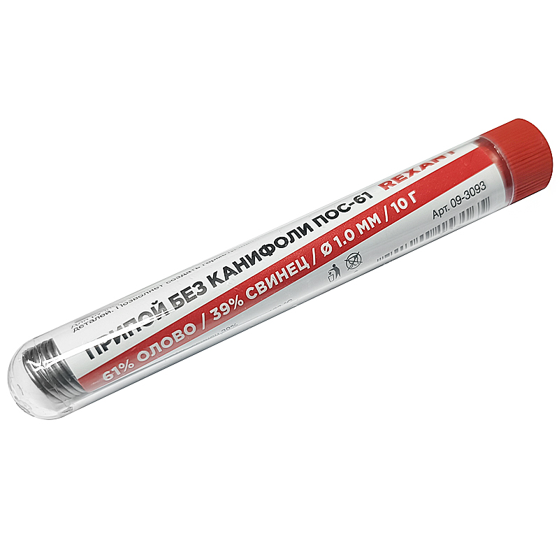 Припой без канифоли ПОС-61 REXANT, 10 г, Ø1,0 мм, (олово 61%, свинец 39%), колба