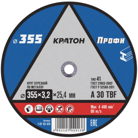 Диск отрезной по металлу 355*3,2*25,4 Кратон A30 TBF