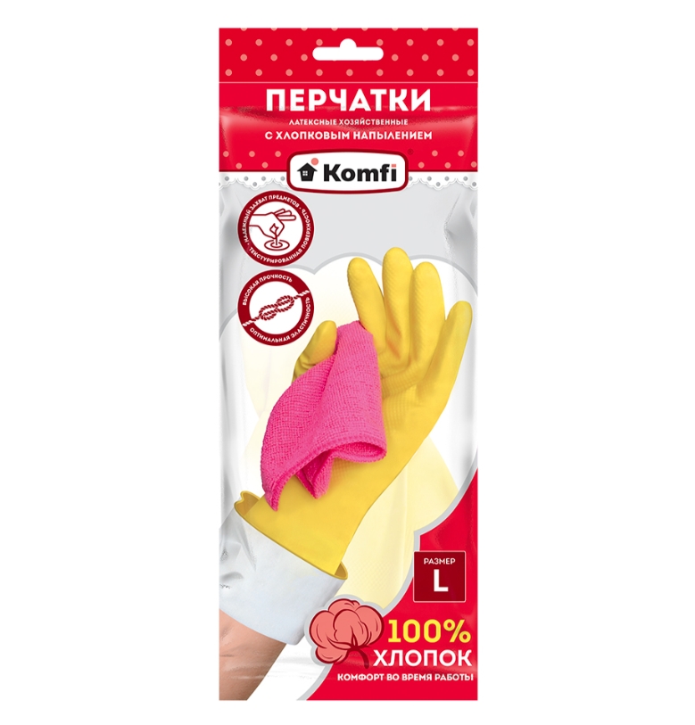Перчатки латексные хозяйственные с х/б напылением, Komfi L, жёлтые