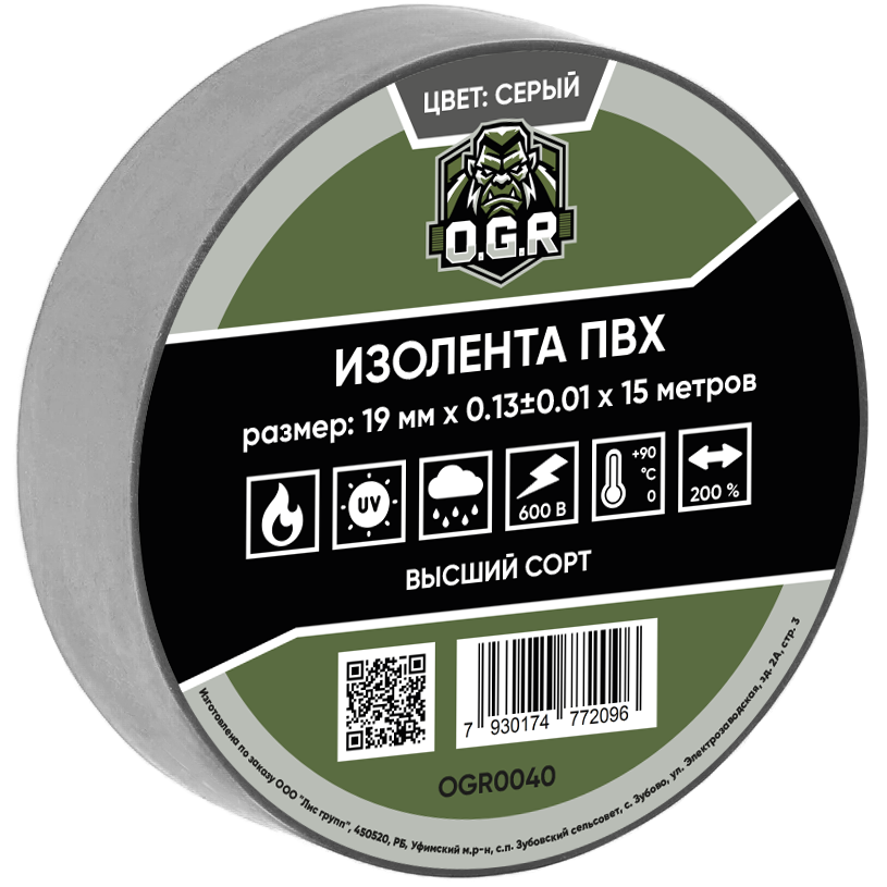 Изолента 19мм*15м ПВХ, OGR, серая