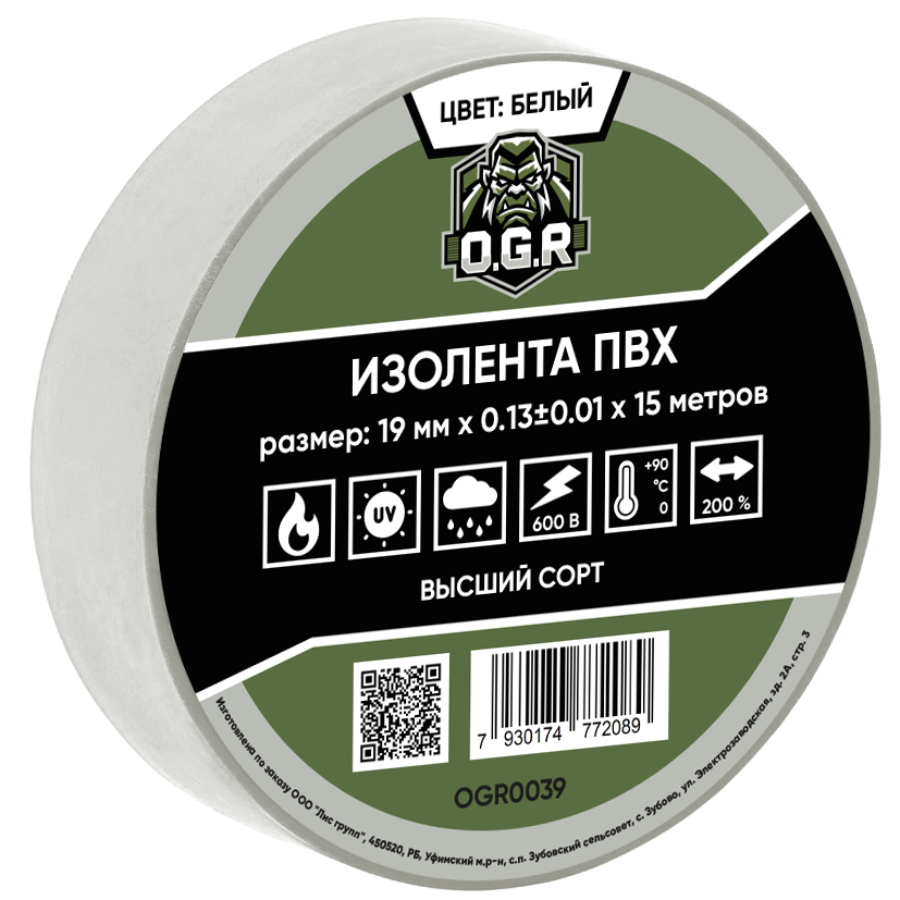 Изолента 19мм*15м ПВХ, OGR, белая