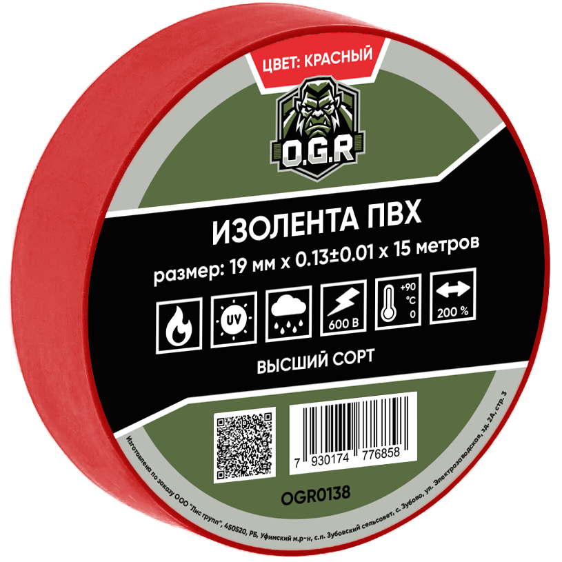 Изолента 19мм*15м ПВХ, OGR, красная