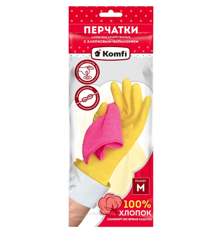 Перчатки латексные хозяйственные с х/б напылением, Komfi M, жёлтые