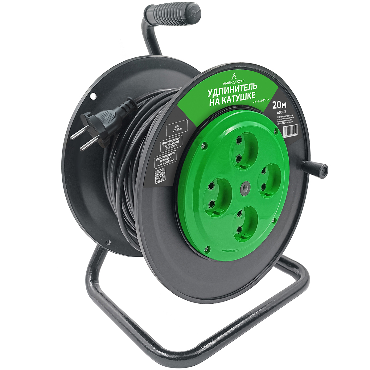 Электроудлинитель на катушке 4гн 20м ПВС 2*0,75мм², б/заземления, 6А, 1500Вт, Амбидекстр