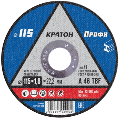 Диск отрезной по металлу 115*1,6*22 Кратон A46 TBF