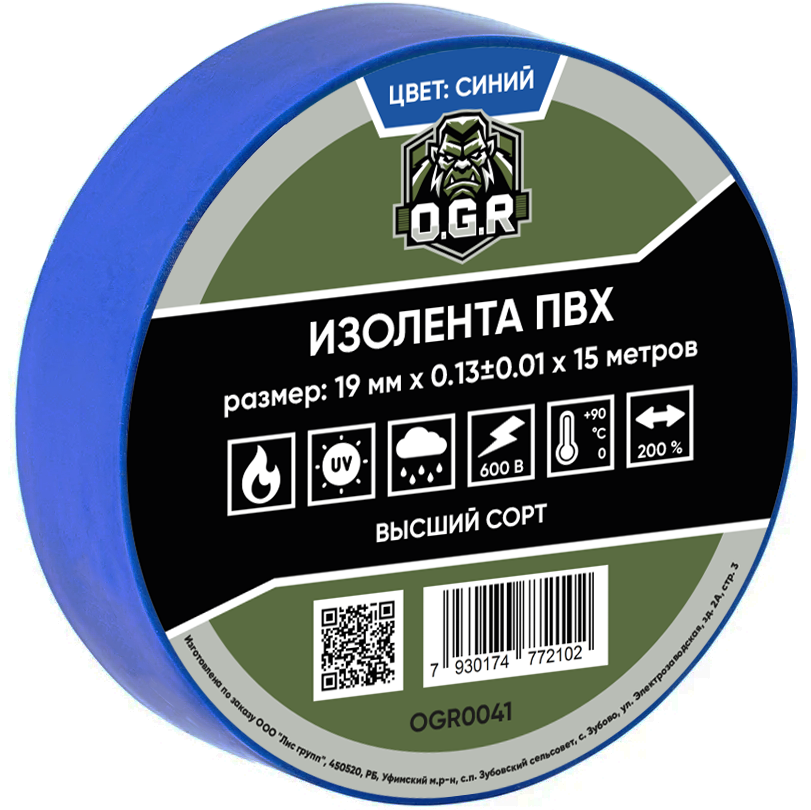 Изолента 19мм*15м ПВХ, OGR, синяя