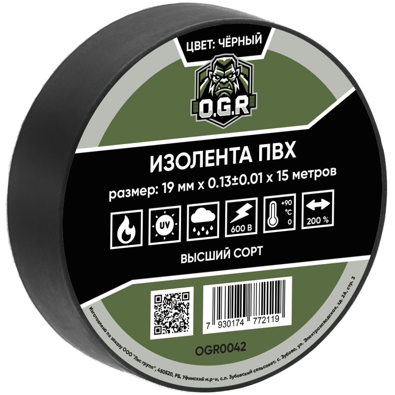 Изолента 19мм*15м ПВХ, OGR, черная