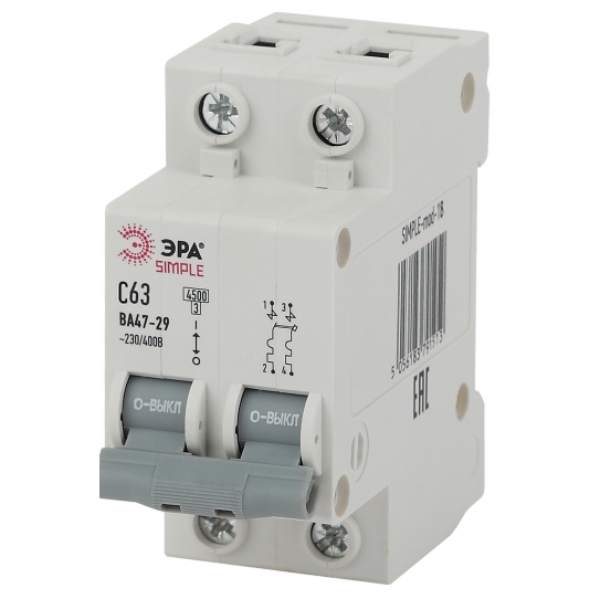 Автоматический выключатель 2P 63A (C) 4.5кА ВА 47-29, SIMPLE-mod-18 ЭРА