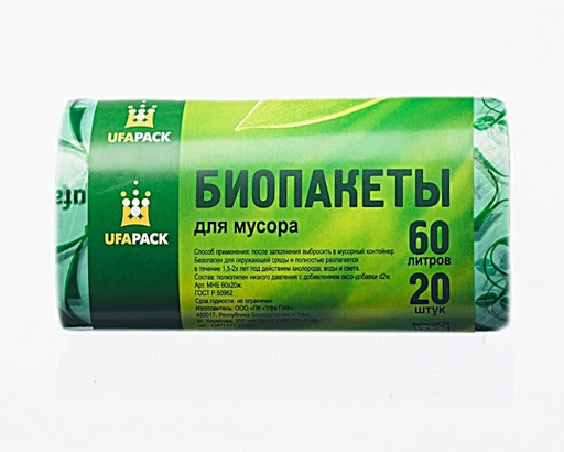 Пакеты для мусора БИО (биоразлагаемые) ПНД "Уфа ПАК" 60 л. 20 шт. зеленые, р. 54x64см, 15мкм (18)