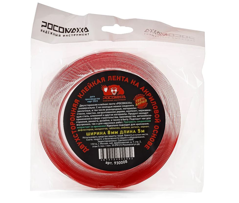 Лента клеящая 2-х сторонняя 8мм* 5м акриловая прозрачная РОСОМАХА