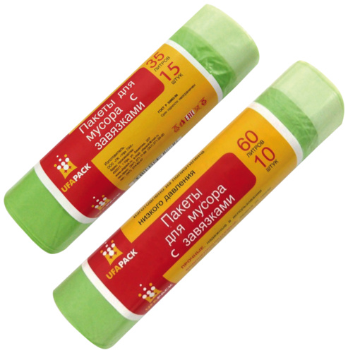 Пакеты для мусора ПНД "Уфа ПАК" С ЗАВЯЗКАМИ 60 л. 10 шт. салатовые, р. 55-64см, 15мкм (30)